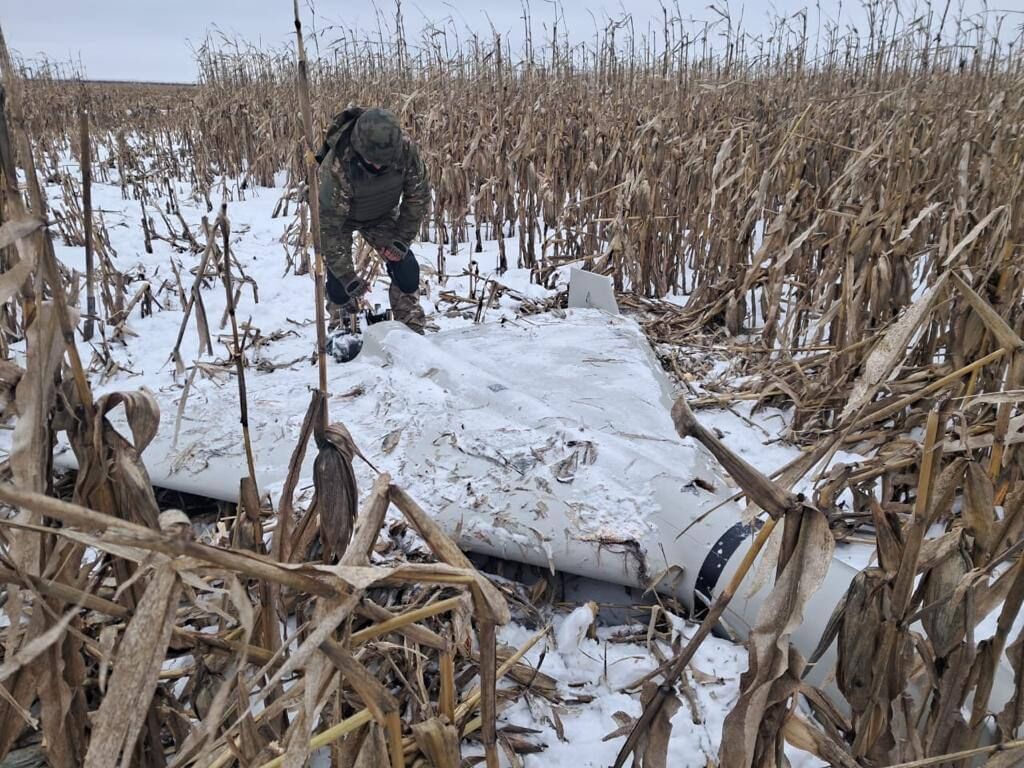 A Ukrainian soldier inspects a downed Russian Shahed drone. Image Telegram.